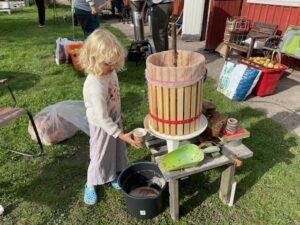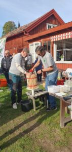 Det var full fart på äppelmustningen hela dan, och en del fick även provsmaka. Äppelpajer bakades och tävlades med och en expertjury smakade och bedömde. Efter att juryn sagt sitt fick alla smaka på läckerheterna. Vinnande paj hade bakats av Vanja Persson, som var både god och vacker . Grattis!
