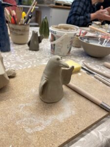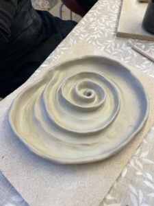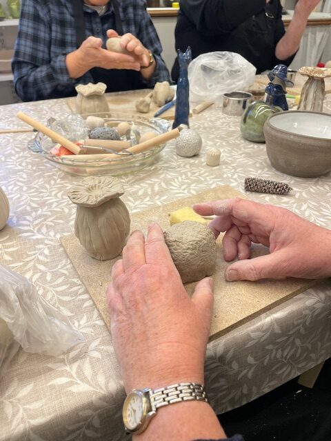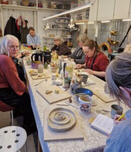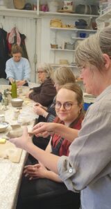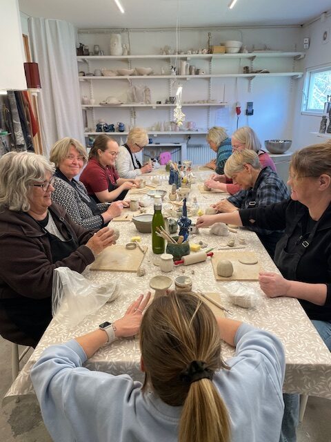 Några av Trädgårdssällskapets medlemmar vågade sig på att testa keramik. Vi var åtta som samlades runt bordet hos BompDesign i Vagnhärad för att försöka förvandla 1 kg stengodslera till nåt konstnärligt. Man hinner oväntat mycket på ett par timmar, även om väntan därefter – från knådande till färdig produkt – tar ett par veckor med torktider, glaseringar och bränningar. Men en fantastiskt trevlig upplevelse och en aning meditativ (och stundtals frustrerande).